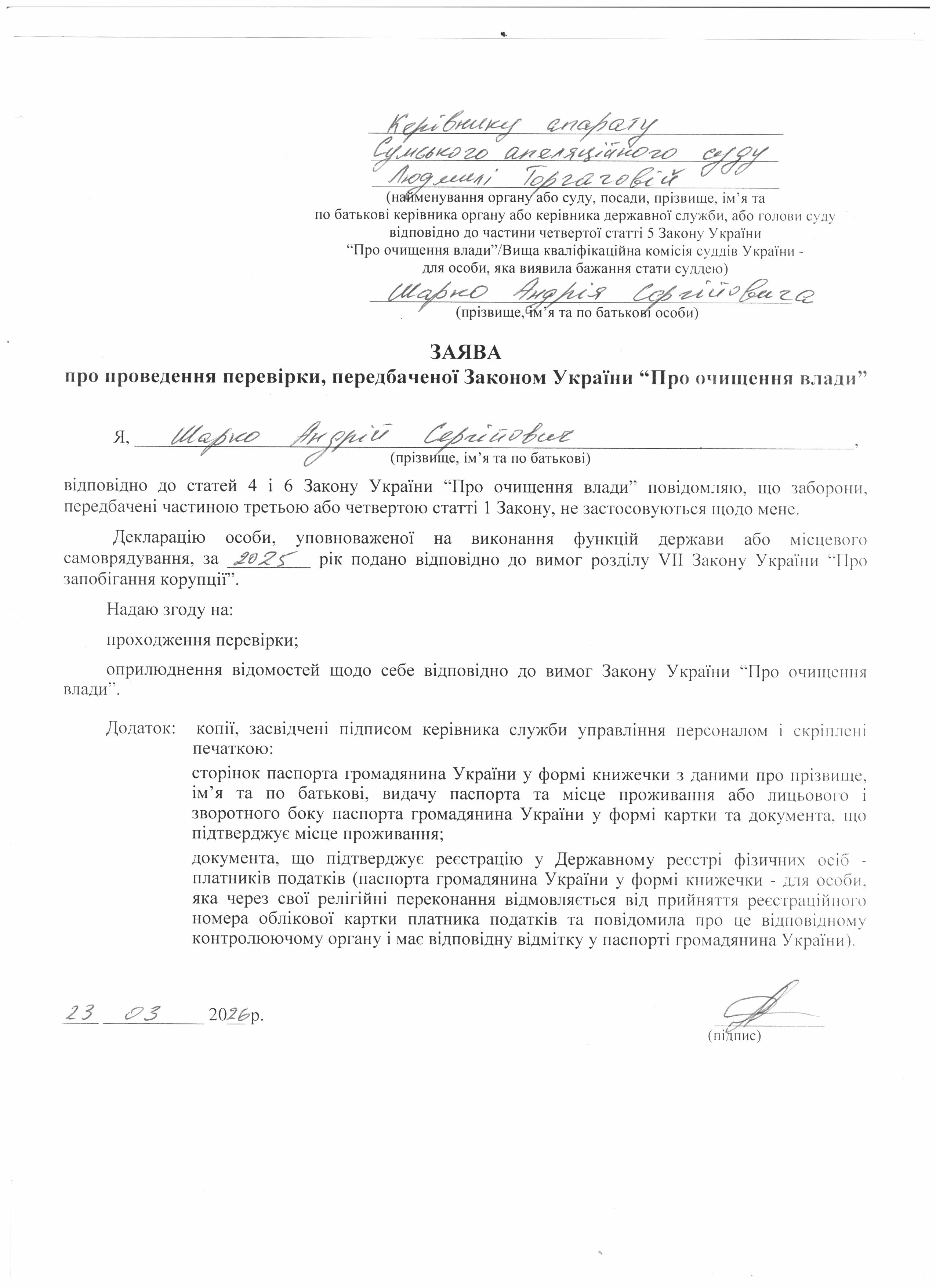 Повідомляємо, що 23 березня 2026 року у Сумському апеляційному суді розпочато перевірку, передбачену Законом України «Про очищення влади», щодо Шарка Андрія Сергійовича, головного спеціаліста сектору інфораційних технологій та технічного захисту інформації, (заява в електронній формі додається).